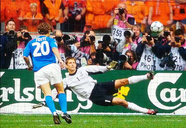 Amsterdam, Amsterdam Arena, 29 giugno 2000. Nella semifinale degli Europei l’Italia elimina ai rigori i padroni di casa dell’Olanda, con un’epica partita difensiva in 10 contro 11 e sorretta dalle parate di Toldo, capace di neutralizzare ben 3 rigori di cui il primo nei tempi regolamentari. Il terzo rigorista azzurro è Francesco Totti, che spiazza Van der Sar con il primo (che da lì in poi diventerà leggendario) rigore “a cucchiaio” della propria carriera